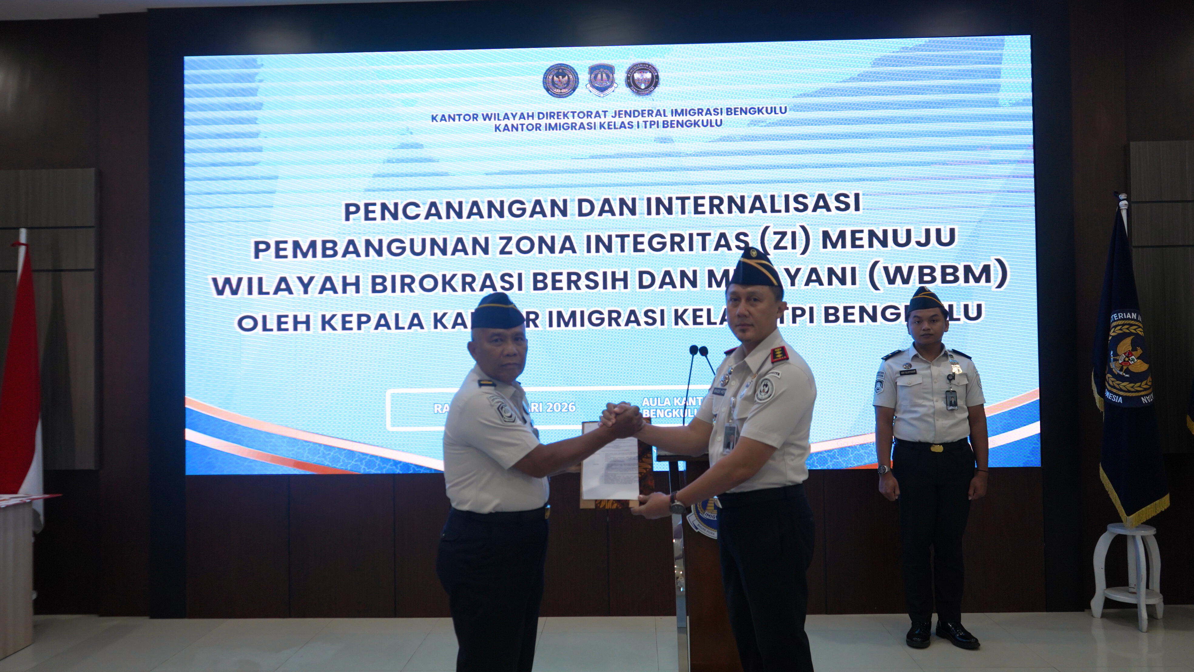 Bengkulu – Kantor Imigrasi Kelas I TPI Bengkulu melaksanakan kegiatan Pencanangan dan Internalisasi Pembangunan Zona Integritas (ZI) Menuju Wilayah Birokrasi Bersih dan Melayani (WBBM) pada Rabu, 28 Januari 2026, bertempat di Aula Kantor Imigrasi Kelas I TPI Bengkulu.