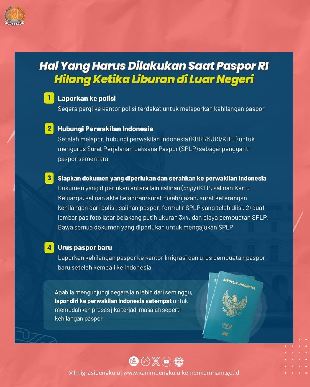 Sahabat Mido, untuk yang pernah kehilangan paspor di luar negeri pasti menjadi pengalaman yang tak terlupakan. Berikut ini hal yang harus Sahabat Mido lakukan jika paspor kamu hilang ketika sedang liburan ke luar negeri. Simak infografis berikut ini ya.