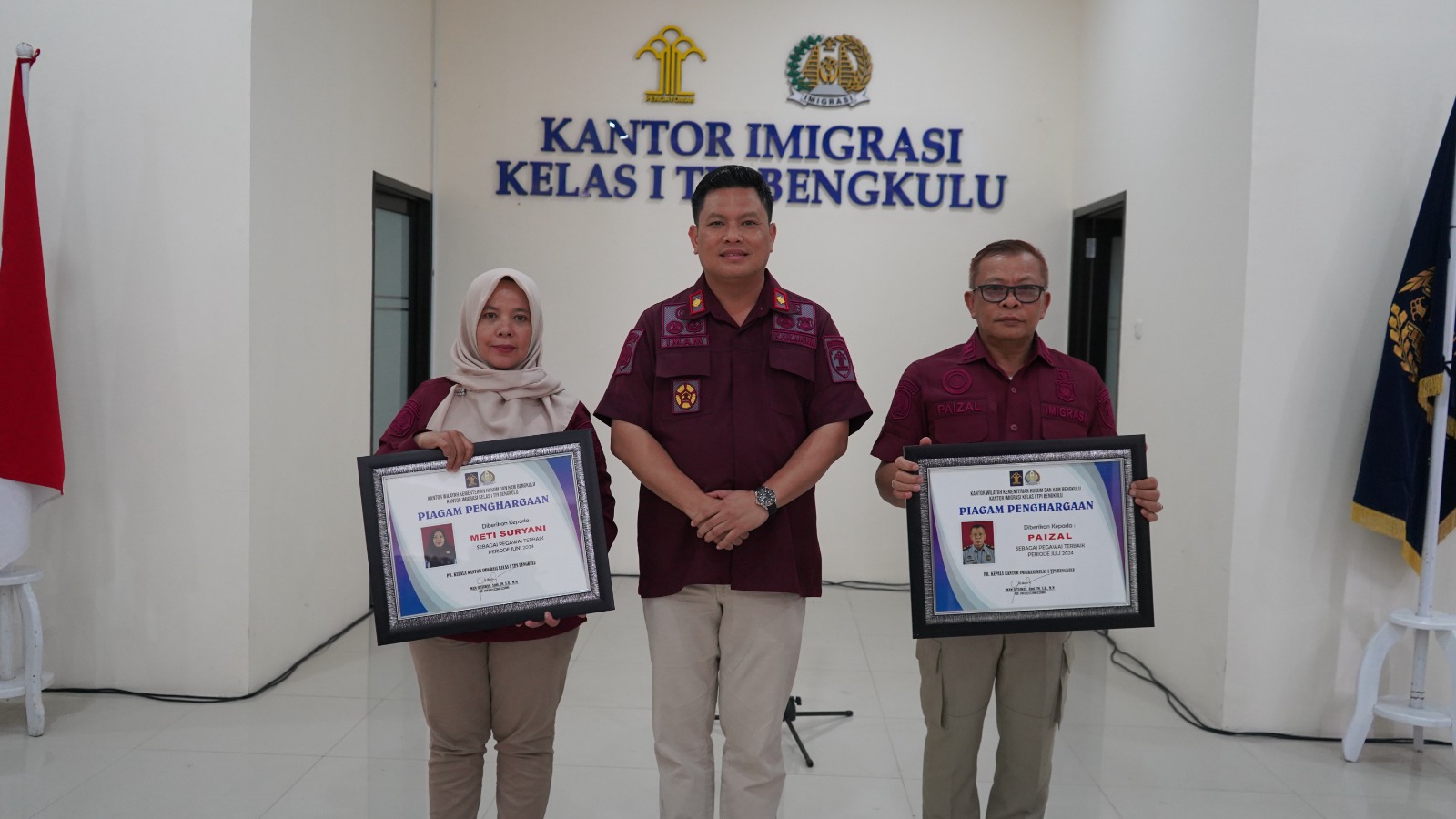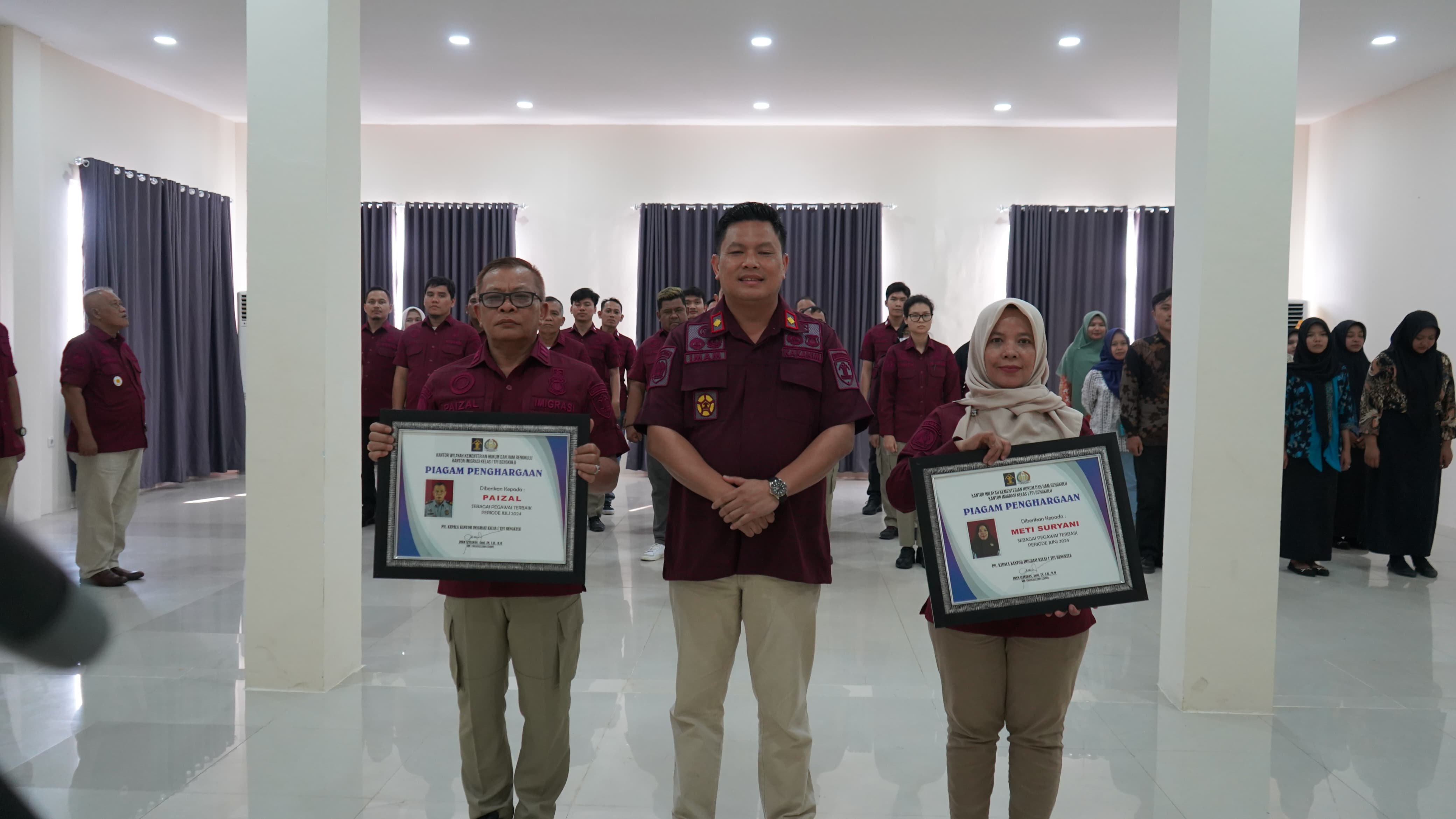 Bengkulu, 22 Agustus 2024 – Pelaksana Tugas (Plt) Kepala Kantor Imigrasi Kelas I TPI Bengkulu, Imam Setiawan, memberikan penghargaan kepada dua orang pegawai terbaik pada bulan Juni dan Juli 2024. Penghargaan tersebut diberikan kepada Meti Suryani dan Paizal atas dedikasi dan kinerja yang baik dalam pelayanan keimigrasian. Acara penghargaan ini dilaksanakan pada hari Kamis, 22 Agustus 2024.